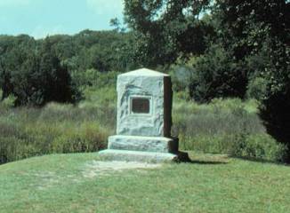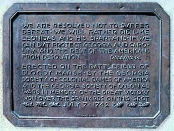 Stone monument on St. Simons Island commemorating the victory of James Oglethorpe's forces over a Spanish invasion force at the Battle of Bloody Marsh. The monument is on dry land at the edge of the marsh where the July 1742 battle was fought.